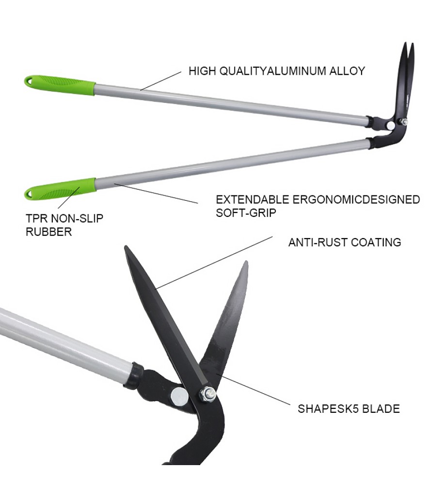 These garden hedge pruners feature a long, extendable handle combined with an ergonomic, soft grip, making long-distance pruning easier, reducing bending and climbing, and ensuring safety and efficiency.